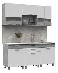 Бетонный декор ЛДСП "Ателье светлый", объединяющий в себе матовую поверхность с полированным покрытием, с эффектом патины, прекрасно сочетается со спокойным ЛДСП "Белый шагрень". Контрастная кромка на фасадах придает коллекции "Денвер" изысканность и актуальность. Вкладные створки кухни утоплены внутрь бетонного корпуса, что создает рамочный эффект фасадной группы.