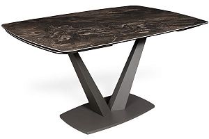 Замечательный дизайн для небольшого стола с полностью автоматическим механизмом одновременного раздвижения двух торцевых вставок! Абстрактный рисунок мрамора на закругленной керамической столешнице уравновешен строгой прямолинейностью V-образного металлического подстолья, обладающего большой прочностью. Стол эргономичен во всех отношениях и станет безусловным фокусом любой обеденной зоны.