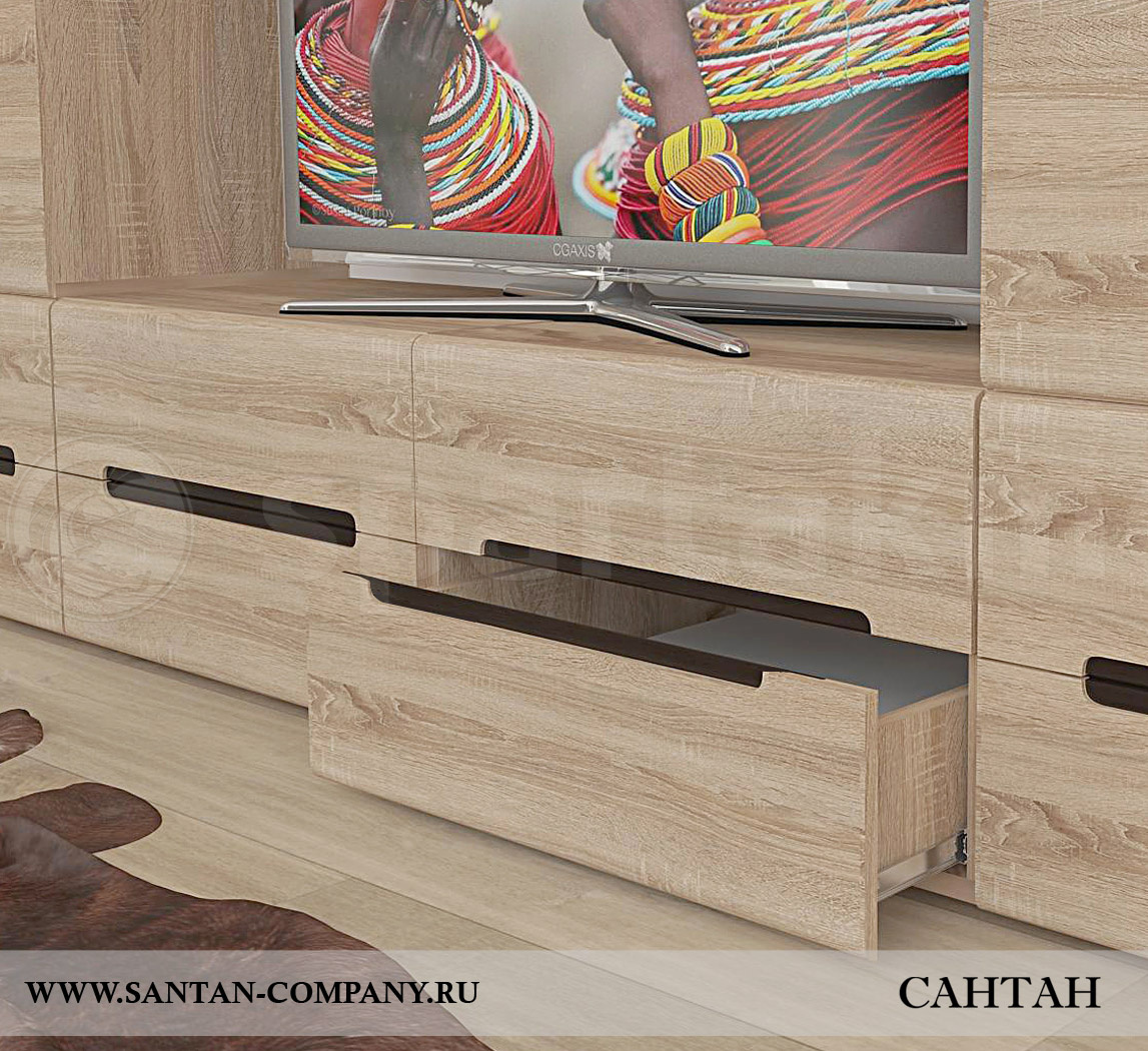 В шкафах, тумбах и антресолях используется фурнитура BAYARD: направляющие полного выдвижения, петли с доводчиком, регулируемые опоры L-20. Фасады МДФ под пленкой ПВХ, стекло декорировано фотопечатью черного и белого цвета с обработкой фацет. Особенностью серии является интегрированная ручка, которая придает гостиной индивидуальность и практичность.