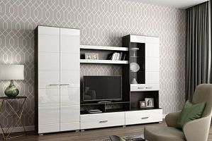 Состав стенки: шкаф для одежды, подставка под ТВ, двустворчатый шкафчик с витриной, вместительные выдвижные ящики, полочки для интерьерных украшений.МАТЕРИАЛ - ЛДСПМАТЕРИАЛ - МДФМДФ — плитный строительный материал, изготавливаемый из мелкой древесной стружки с добавлением натуральных связующих компонентов. Он обладает гладкой, однородной поверхностью, которая может покрываться лаком и краской, облицовываться пластиком или шпоном. Произведенные из него изделия обладают длительным сроком службы, экологической безопасностью, износостойкостью и устойчивостью к воздействию влаги.
