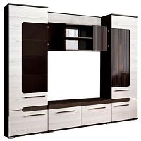 Стильная современная стенка для гостиной. Изготовлена из ЛДСП, отделана под натуральное дерево. Мебель собрана с использованием надежной фурнитуры, изготовлена из качественных, экологичных материалов. Гостиная прослужит вам много лет и сделает дом уютнее.