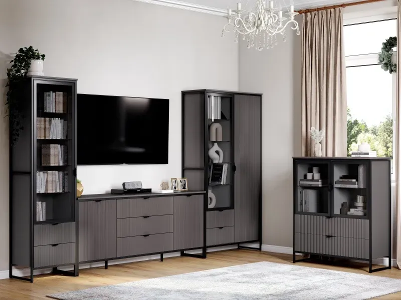 Коллекцию модульной гостиной "Нора" отличает современный оригинальный стиль. Декоративная продольная фрезеровка на фазадах из МДФ и опоры на металлокаркасе соответствуют модным тенденциям этого года в ведущих зарубежных коллекциях.