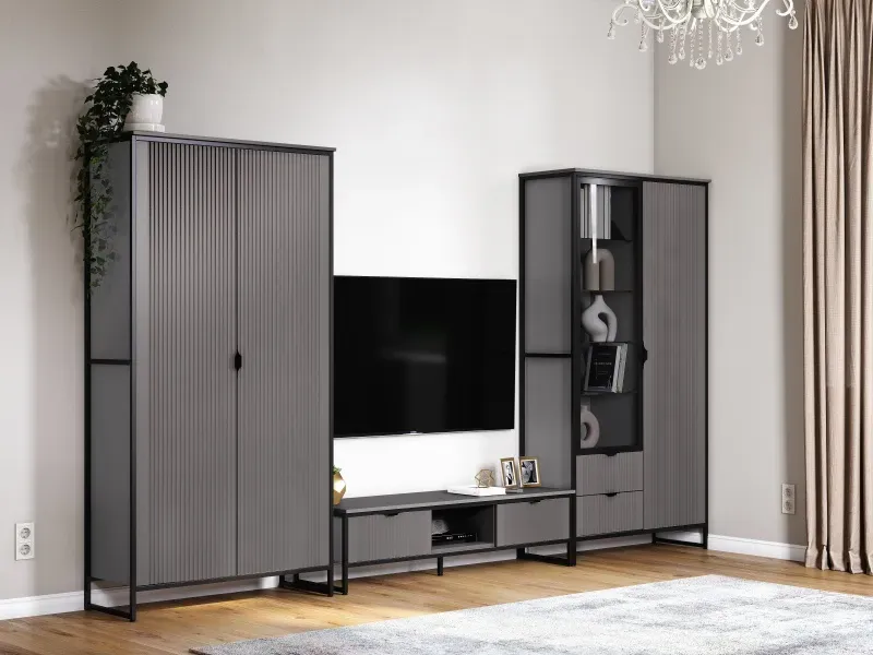 Коллекцию модульной гостиной "Нора" отличает современный оригинальный стиль. Декоративная продольная фрезеровка на фазадах из МДФ и опоры на металлокаркасе соответствуют модным тенденциям этого года в ведущих зарубежных коллекциях.