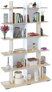 Наполнение стеллажа состоит из множества открытых полочек. На них можно с удобством разместить книги, журналы, косметические средства и различные предметы декора.