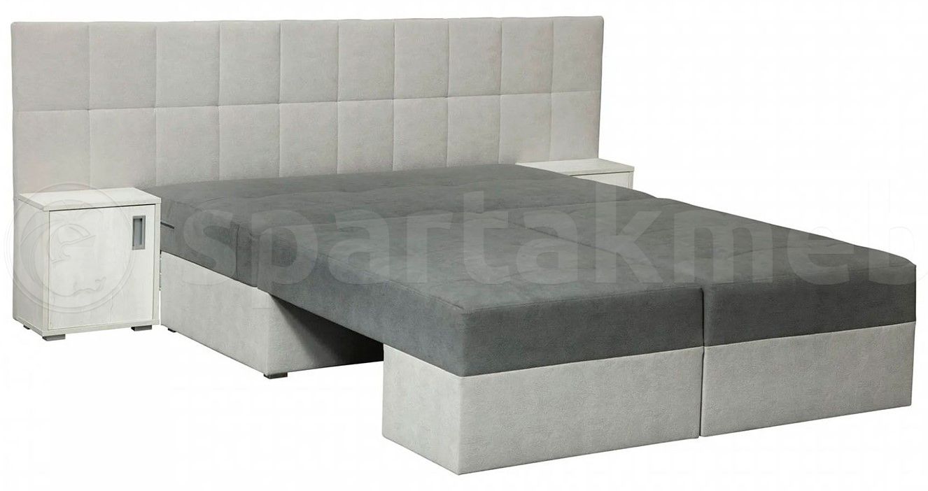 Половинки дивана совмещаются к середине при помощи механизма трансформации «ножницы», легко фиксируясь между собой, образуют полноценное место двухспальной кровати 2000х1500 с пружинным матрасом, с задекорированной утяжками мягкой прикроватной спинкой и двумя открывающимися тумбами, ручки открывания тумбочек оформлены в цвете матовый хром.Механизм трансформации имеет внешние сходства с работой обычных ножниц. Чтобы привести его в действие, подвижные части дивана поворачивается на 90 градусов относительно неподвижной части. Далее, когда деталь повернута, происходит процесс совмещения двух половин.