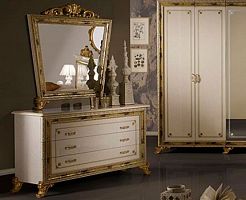 Комод Катя с зеркалом от Российской фабрики «ДИА мебель» выполнен в бежевом цвете с глянцевым покрытием. Большое просторное зеркало увенчанное золотой короной, поможет вам придать атмосферу роскоши. Такой комод имеет три выдвижные полки. Он будет не заменим в вашей спальне.