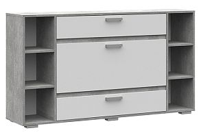 Корпус и часть фасадов выполнены в декоре "Ателье светлый" - это структура бетона, объединяющая в себе матовый эффект с гладким, полированным покрытием, придающим дополнительный эффект патины камню. Каменный декор прекрасно сочетается с шелковистым блеском ЛДСП "Белый шагрень", а контрастная кромка на фасадах в цвет корпуса придает коллекции "Денвер" изысканность и актуальность.