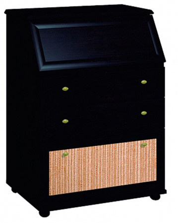 Комод-секретер 1 с откидной крышкой, за которой множество ящичков для различных аксессуаров и ниши. При необходимости его можно закрыть на ключ. Надежные кронштейны click-clack обеспечивают надежность крепления крышки. Нижний фасад модуля Комод-секретер 1 - со вставкой из ткани Хасир в обрамлении профиля в одном стиле со всей коллекцией.
