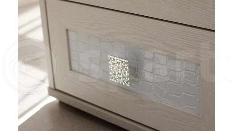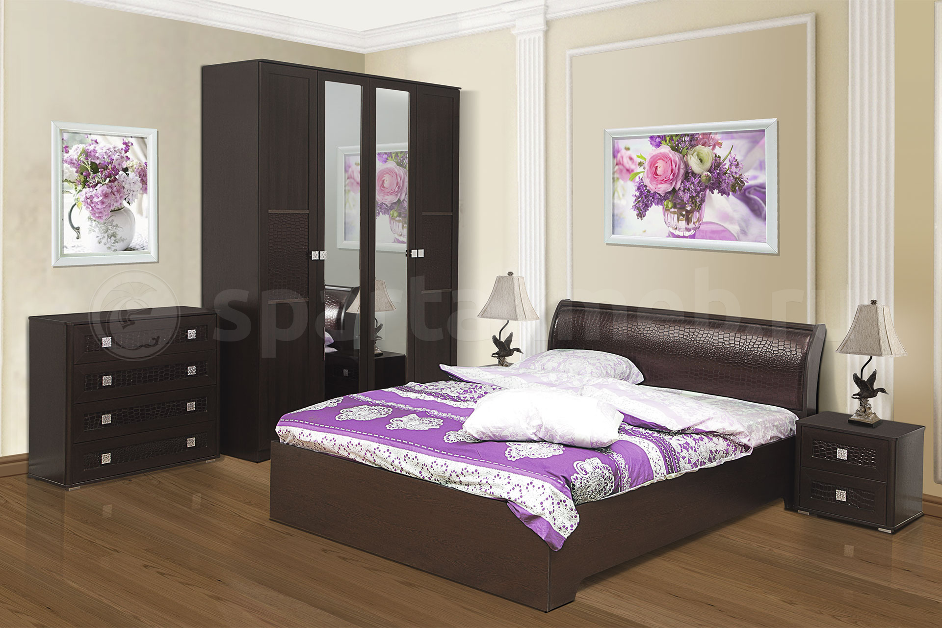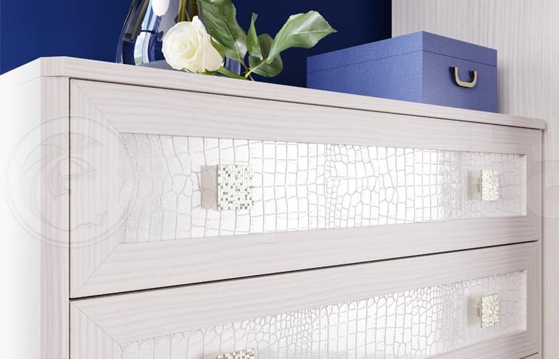 Мебельный гарнитур «Мона» выполнен в приятной цветовой гамме, напоминающей шоколад. В отделке фасадов использован текстурный материал, ассоциирующийся с крокодиловой кожей. В комплект входят шкаф с двумя объёмными отделениями и зеркалами, двуспальная кровать с настилом, две прикроватные тумбы и комод с четырьмя выдвижными ящиками. Изголовье кровати обладает изогнутой формой и обеспечивает удобство в положении полусидя. Вместительные ящики комода позволяют системно располагать большое количество вещей.МАТЕРИАЛ - ЛДСПМАТЕРИАЛ - МДФ
