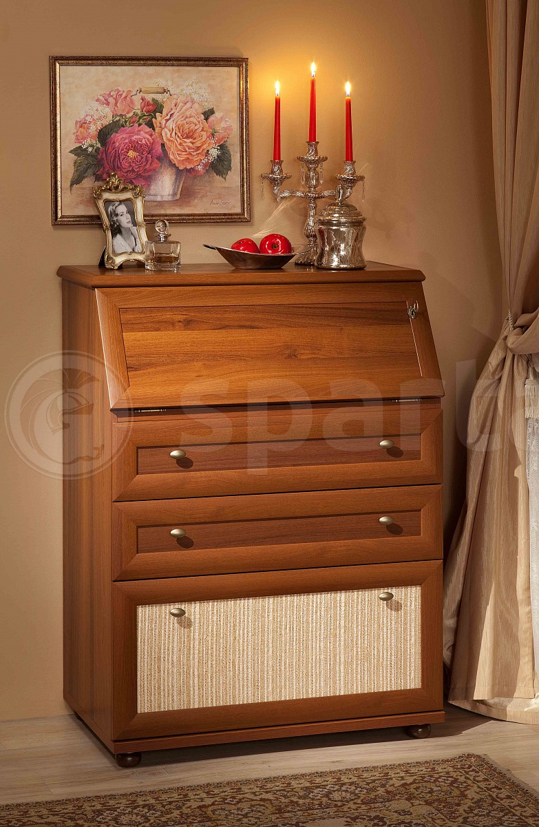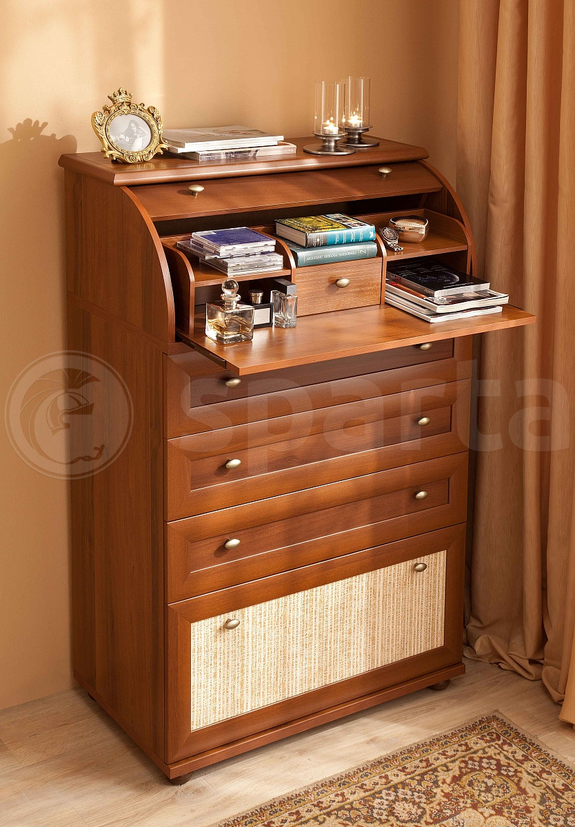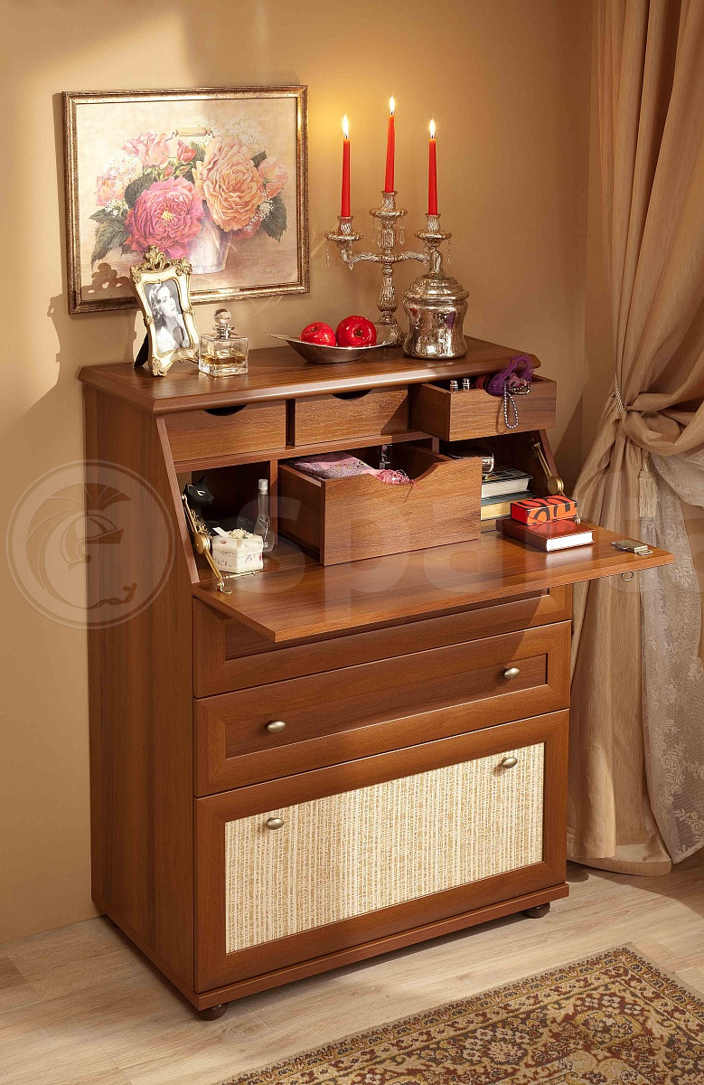 Комод-секретер 1 с откидной крышкой - незаменимый хранитель важных мелочей и документов, с множеством ниш, полочек и ящичков. Встроенный замок с ключиком обеспечит сохранность, а надежные кронштейны click-clack - крепление дверки.