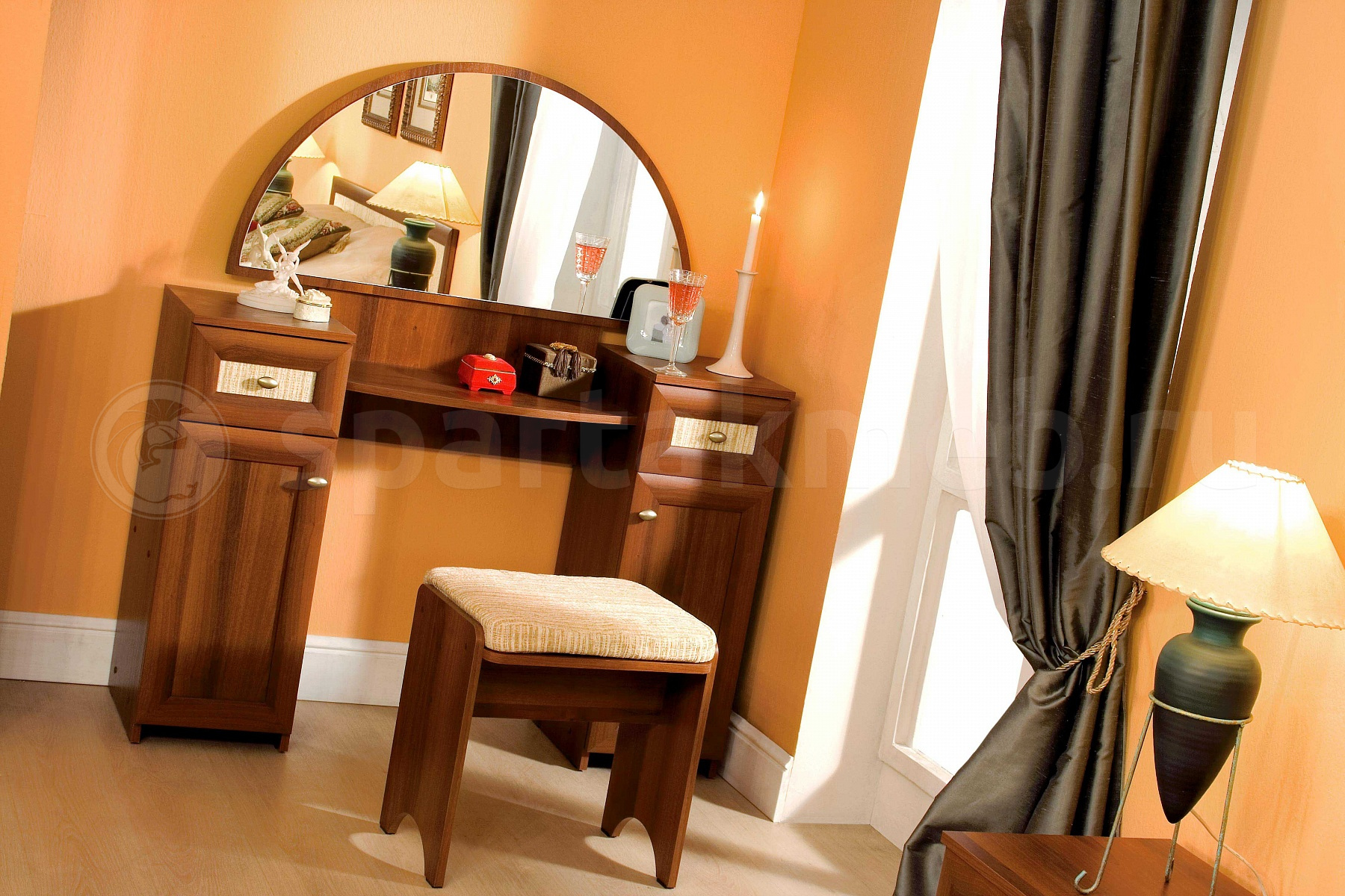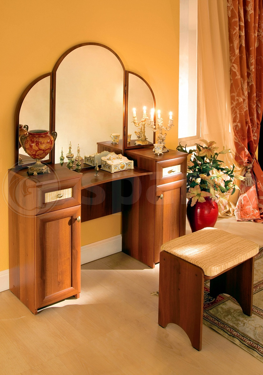 Настоящая женщина не упустит случая зажечь свечи, скинуть пеньюар на банкетку, соблазнительно пройтись пуховкой по шее, плечам, декольте. У нее всегда найдется время побыть немного у зеркала туалетного стола и заодно оценить все его преимущества: вогнутую столещницу, глубокие ящички, трельяжные зеркальные створки, которые будто повторяют дворцовые своды. Сегодня вечером королева - она, и эта ночь только начинается...
