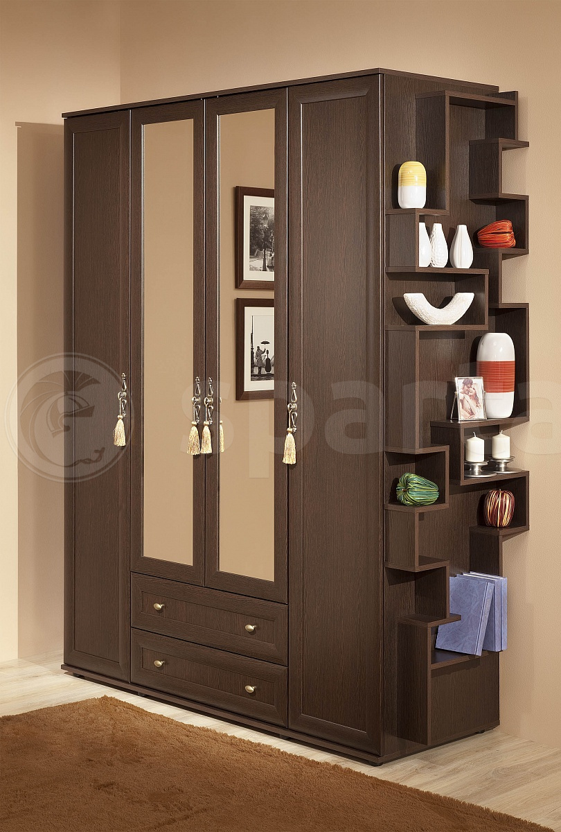 Традицонный четырехдверный шкаф в коллекции Милана выглядит иначе, благодаря своей уникальной фурнитуре: кроме обычных ручек - прочные кисти из атласных нитей сплетенных вручную. Продуманное внутреннее наполнение облегчит задачу разместить в одном мест верхнюю одежду, белье и домашний текстиль.