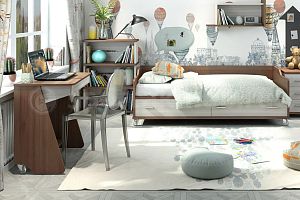 Компактный стол для ноутбука с яркими деталями позволит организовать удобный рабочий уголок в небольшой комнате. Под столешницей есть выдвижной ящик для канцелярии, внизу располагается полочка для книг и папок. Задняя часть опор оборудована колесиками, стол можно легко придвинуть или переместить из комнаты в комнату.